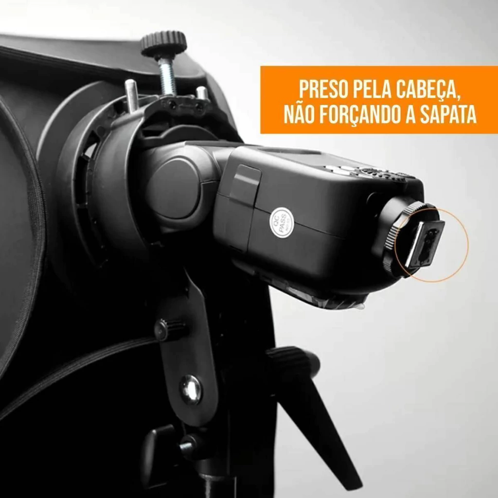 Suporte para fixar o flash é ajustável portanto ele se adequa a grande maioria dos flashes Speedlights disponíveis no mercado.