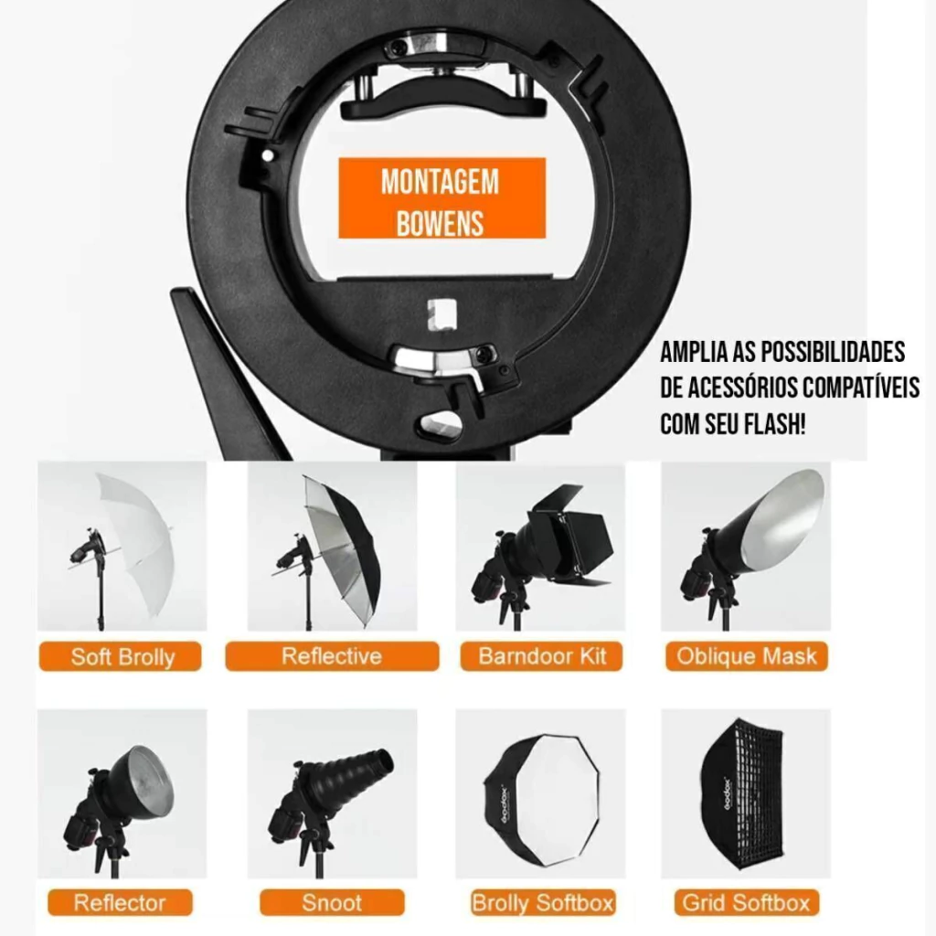 Suporte para fixar o flash é ajustável portanto ele se adequa a grande maioria dos flashes Speedlights disponíveis no mercado.