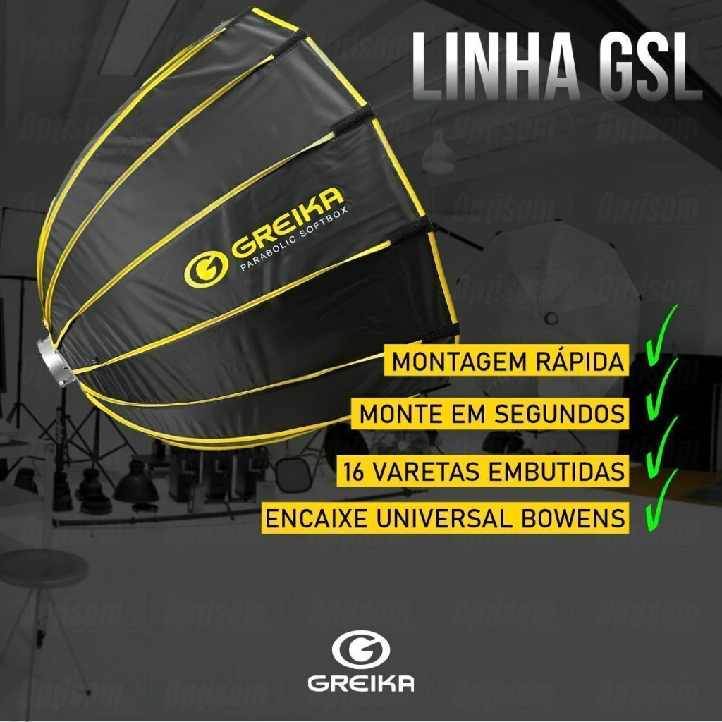Softbox Parabólico Greika 120CM DOBRÁVEL com encaixe BOWENS e montagem RÁPIDA com colmeia GRID para Flash Estúdio e Luz contínua de estúdio.