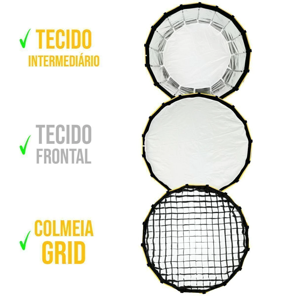 O grande diferencial desse softbox parabólico é sua montagem simples com varetas já embutidas bastando apenas travá-las com um simples clique.