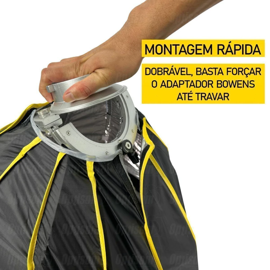 O grande diferencial desse softbox parabólico é sua montagem simples com varetas já embutidas bastando apenas travá-las com um simples clique.