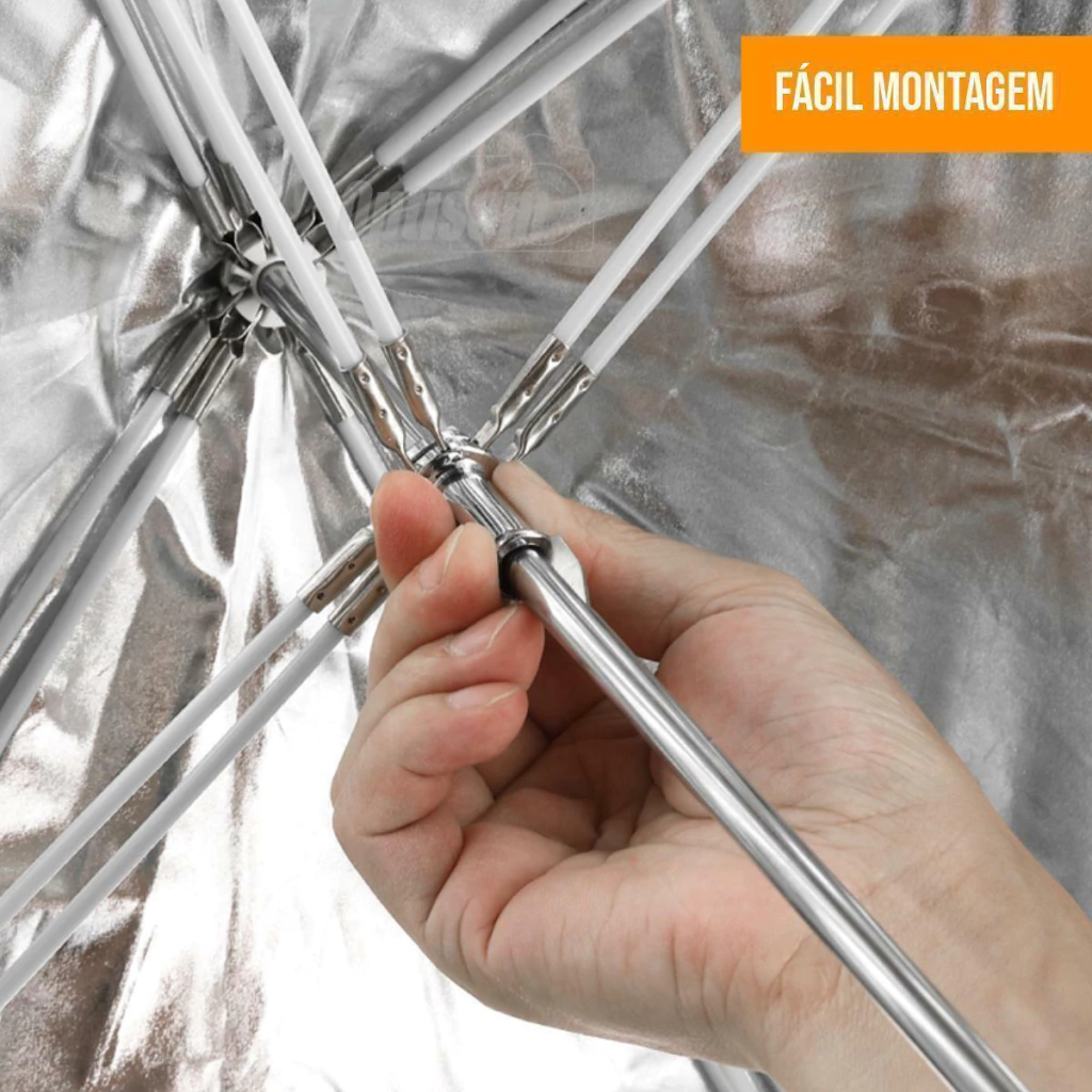 Produto desmontável e portátil de fácil manuseio, o softbox fecha igual um guarda-chuva.