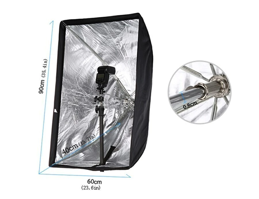 Softbox universal 60x90cm, abertura fácil tipo sombrinha, similar a abertura de um guarda chuva, pode ser usado para luz continua ou luz dura de flash, ai neste caso vai depender da base que vai utilizar (esta base não inclusa)