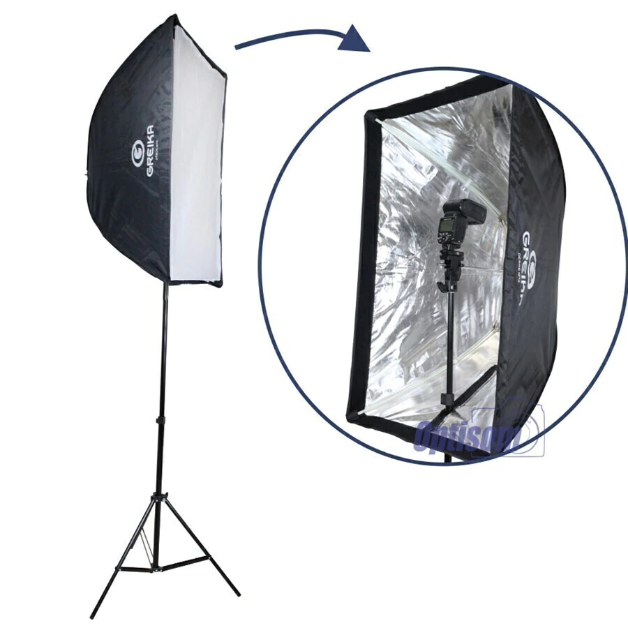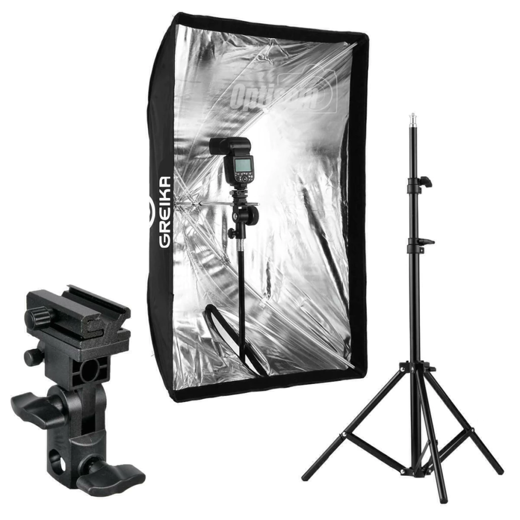 Kit completo com softbox universal 60x90 cm, compativel com o flash dedicado Canon, Nikon, Pentax, Sony, YongNuo, está incluso um suporte que tem encaixe para sapata. Esse suporte pode ser encaixado em qualquer tripé de iluminação (já incluso).