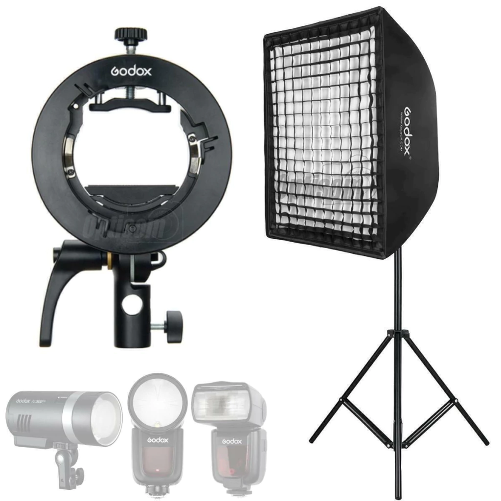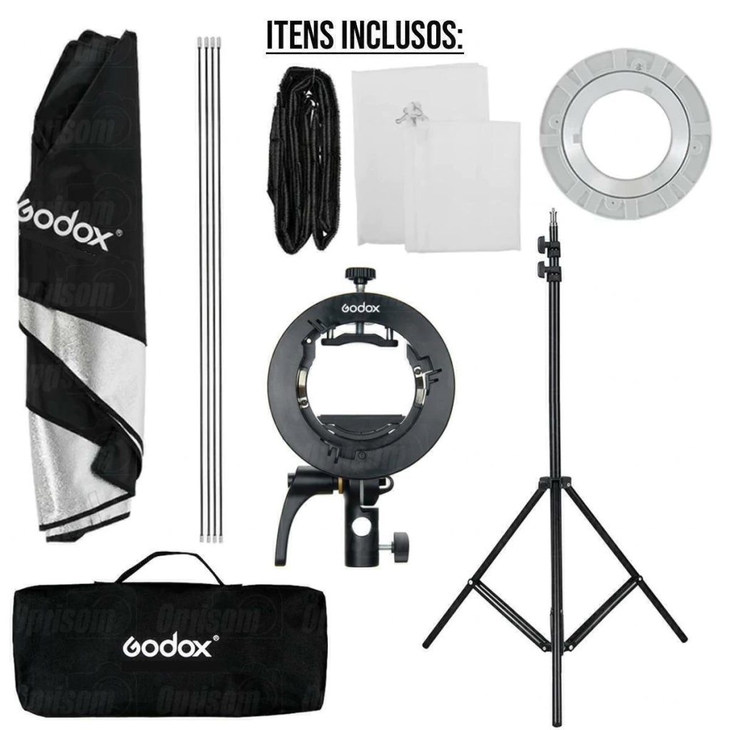 KIT Softbox 60x60cm Godox com Grid e telas difusoras com Suporte adaptador Godox S2 e TRIPÉ