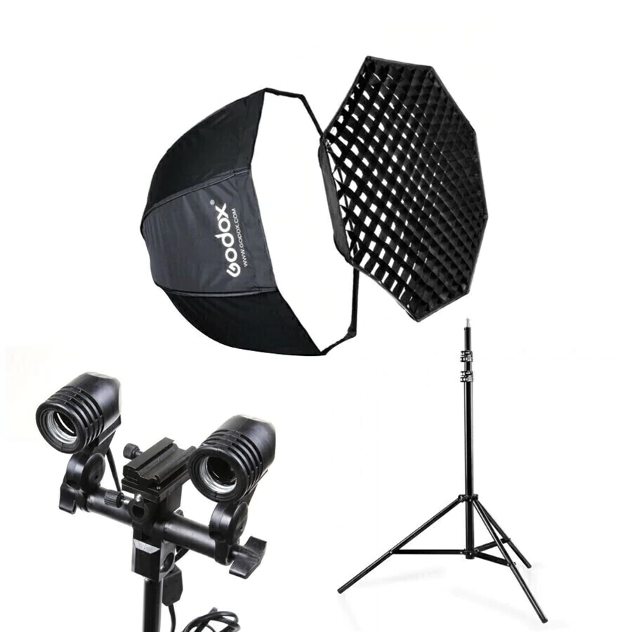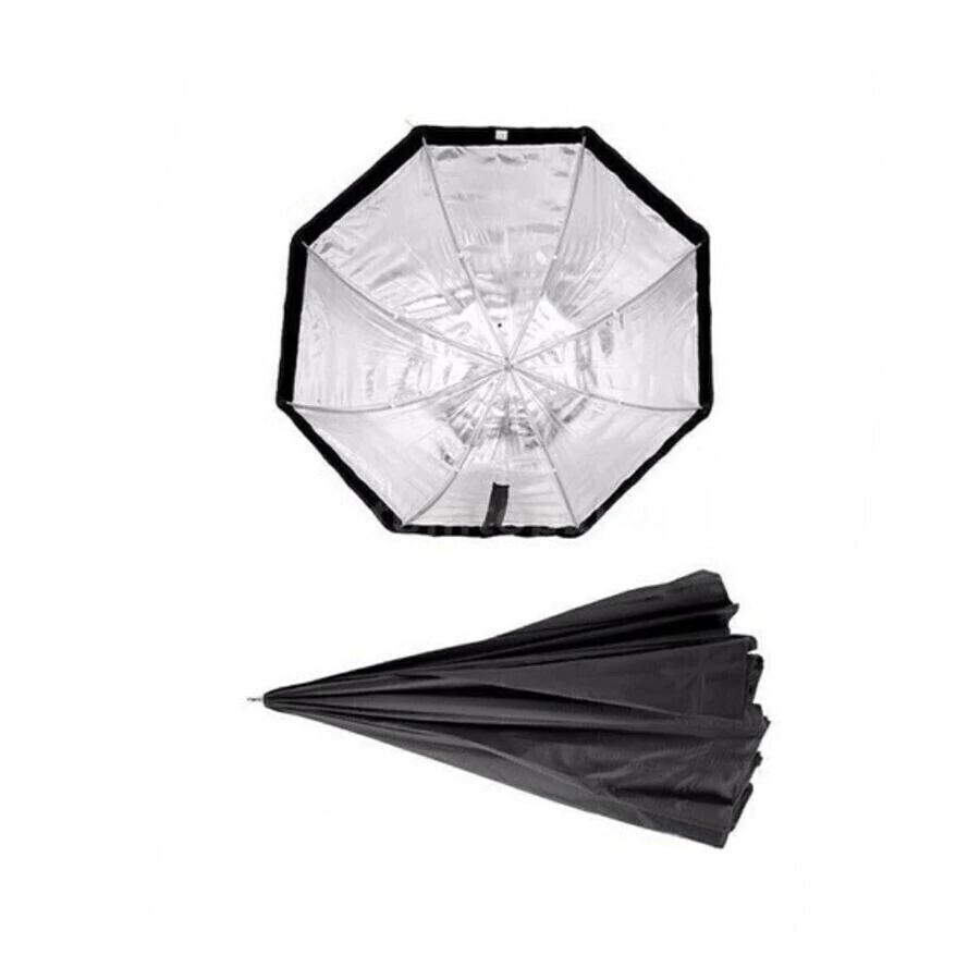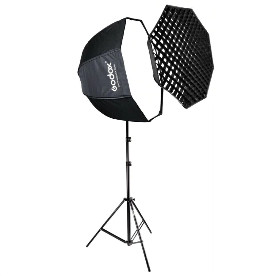 Kit Softbox octogonal 120 cm rebatedor e difusor com grid, produto desmontável e portatil de fácil manuseio, o softbox fecha igual um guarda-chuva. No kit está incluso um tripé de 2,6 metros de altura máxima e mínima de 1 metro e suporta até 5kg;