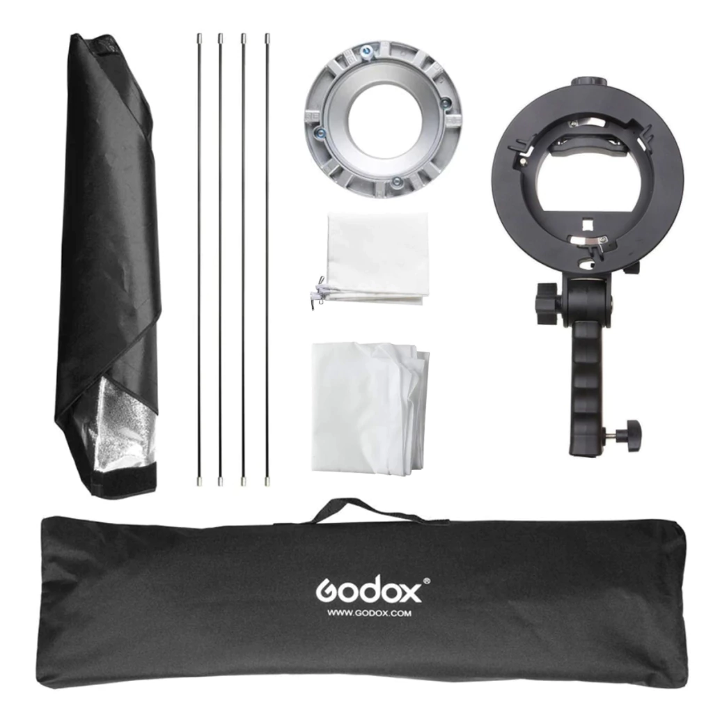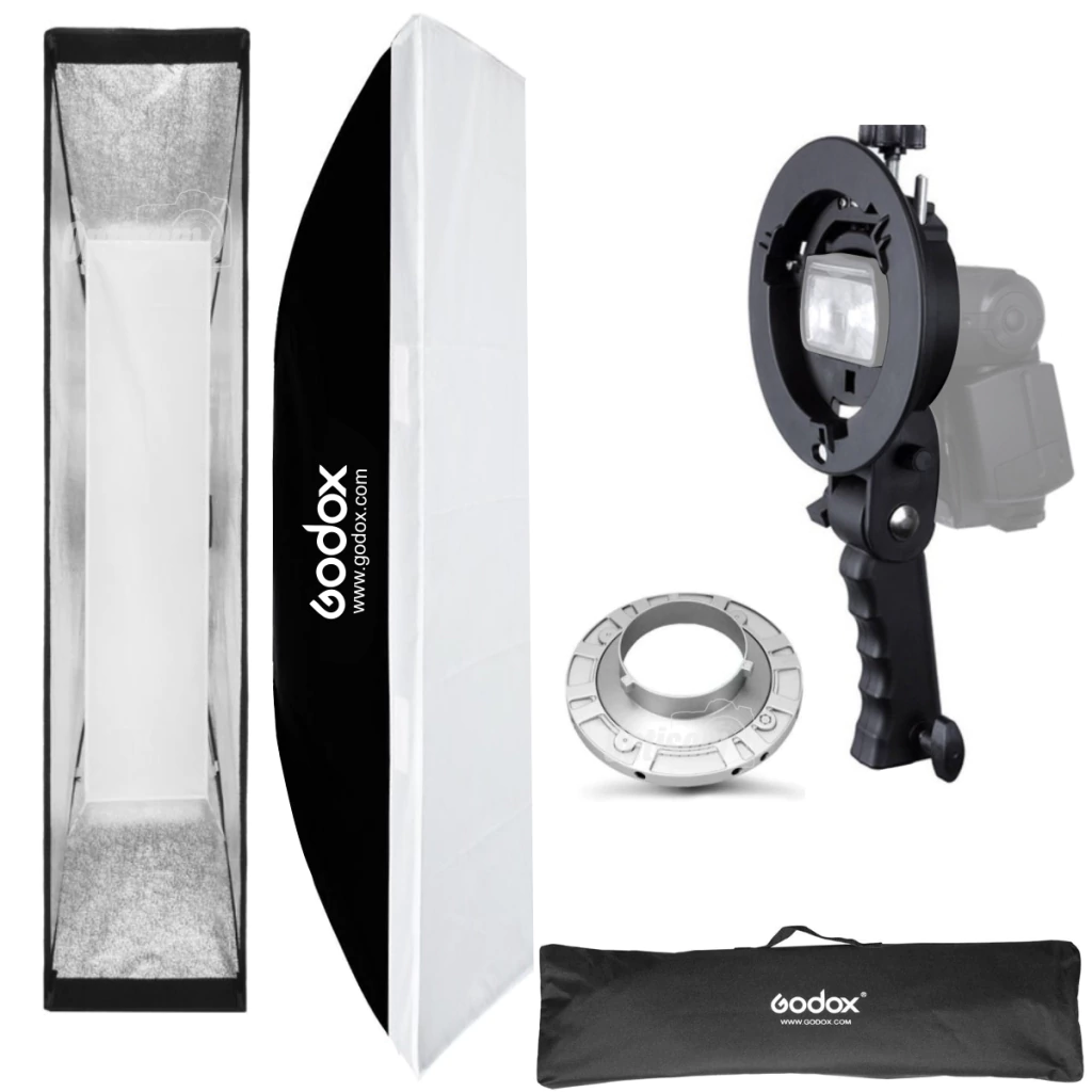 Softbox GODOX STRIP LIGHT de 35 cm de largura por 160 cm de comprimento e 53 cm de profundidade com encaixe PADRÃO BOWENS e SUPORTE PARA FLASH SPEEDLITE UNIVERSAL.