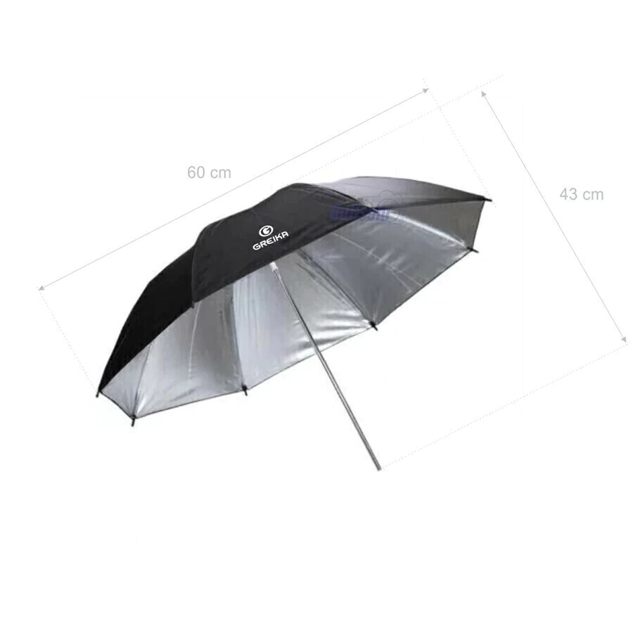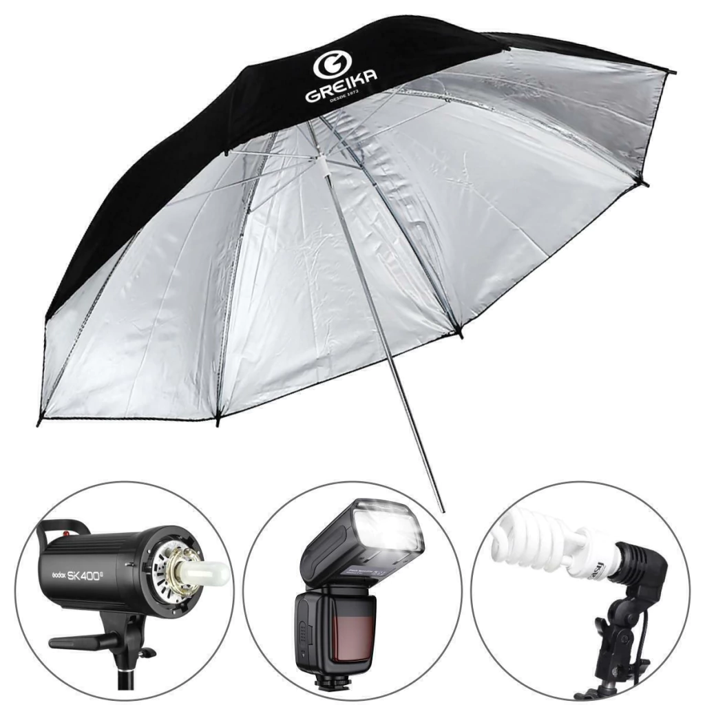 Sombrinha REBATEDORA prateada com face interna prateada, aumenta os reflexos especulares e produz uma imagem de alto contraste (luz dura). É perfeita para vídeo, fotos de produtos, e P&B fotografia.