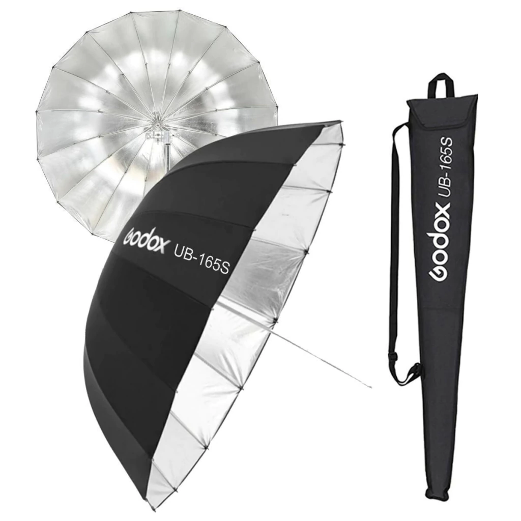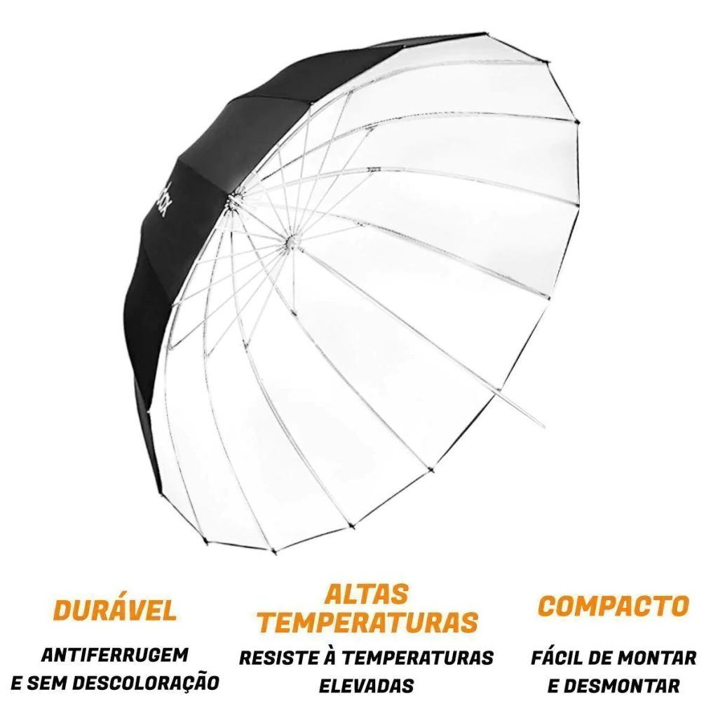 Sombrinha Rebatedora PRETA/PRATA ou PRETA/BRANCA Godox UB-165s/UB-165w é feita em nylon e estrutura em fibra o que garante maior durabilidade e maleabilidade.