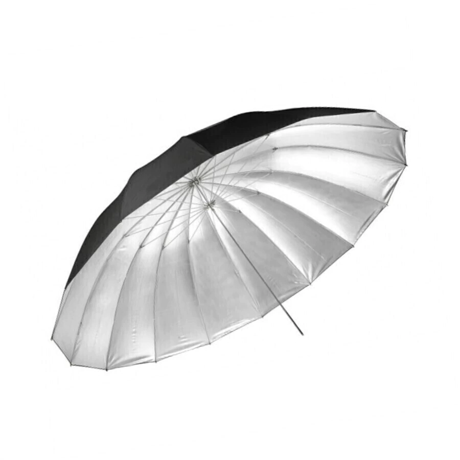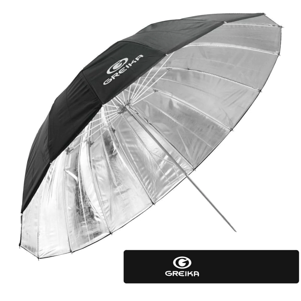 Sombrinha Refletora Preto/Prata BS1675 Greika 180 cm é feita em nylon e estrutura em metal cromado é ideal para seu estúdio fotográfico.
