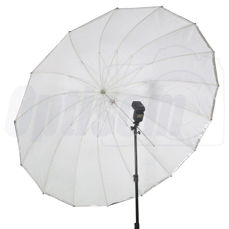 Com o uso desta sombrinha PRETO/BRANCO você tem uma luz rebatida, ou seja, uma luz mais ampla, mais difusa que rebatedores PRETO/PRATA, deixa passar menos luz que sombrinhas só BRANCA e menos saturada que as sombrinhas PRETO/DOURADO.