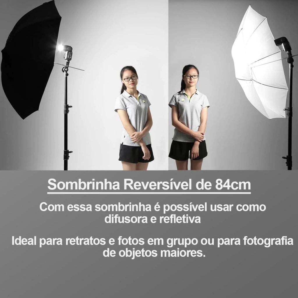 Sombrinha rebatedora com face interna branca e externa preta, você pode remover a capa preta usando a sombrinha como um difusor branco.