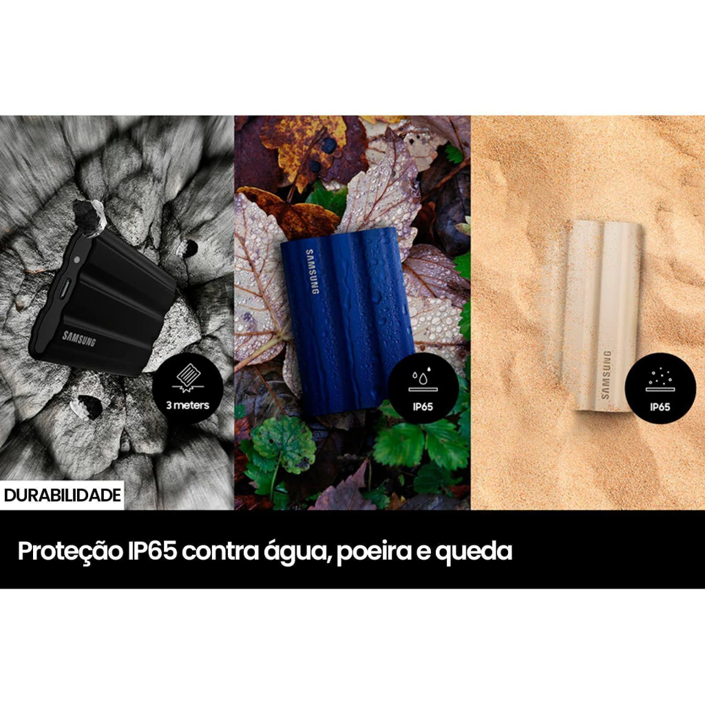 Ideal para uso externo, o SSD portátil Samsung T7 Shield de 2 TB possui exterior emborrachado e classificação IP65, proporcionando aos criadores de conteúdo desempenho e durabilidade.