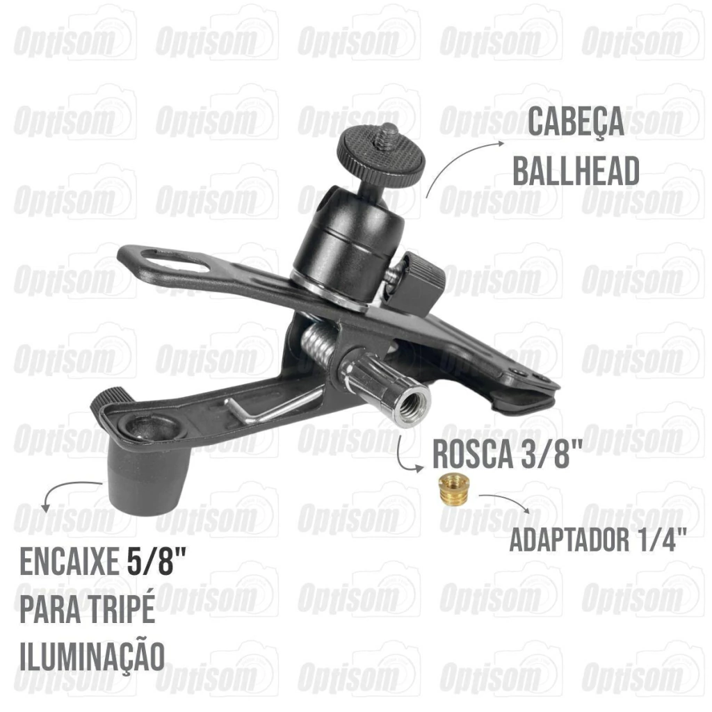 Ele é indicado para ser fixado em tripés (através do encaixe fêmea 5/8" ou em superfícies através do alicate;