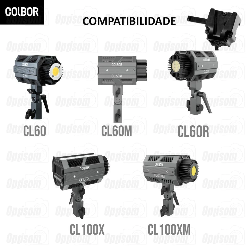 Com esse suporte você pode fixar baterias V-MOUNT em gaiolas/cages; Iluminadores LED Colbor e todos equipamentos que tenham encaixe UNIVERSAL NATO.