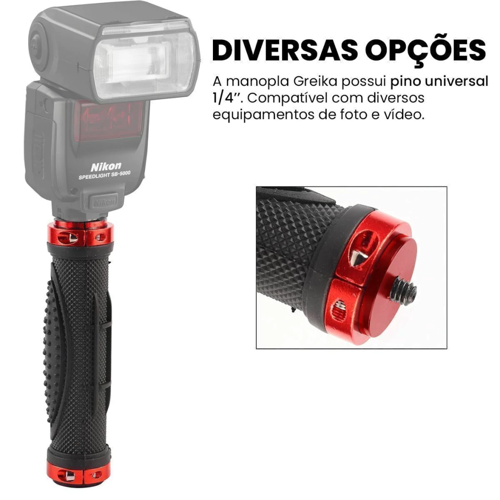 A manopla Greika com encaixe de pino 1/4'' é um acessório essencial para fotógrafos e cinegrafistas.