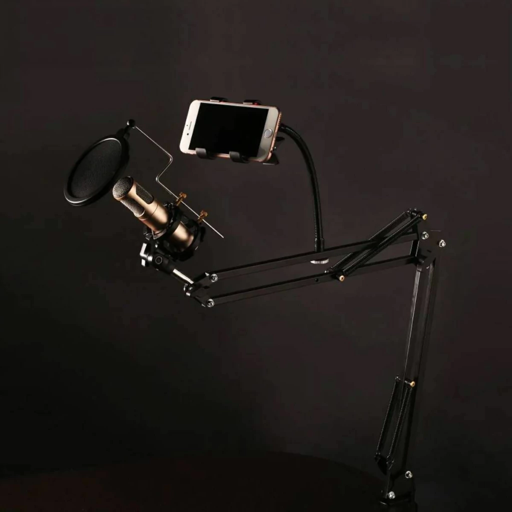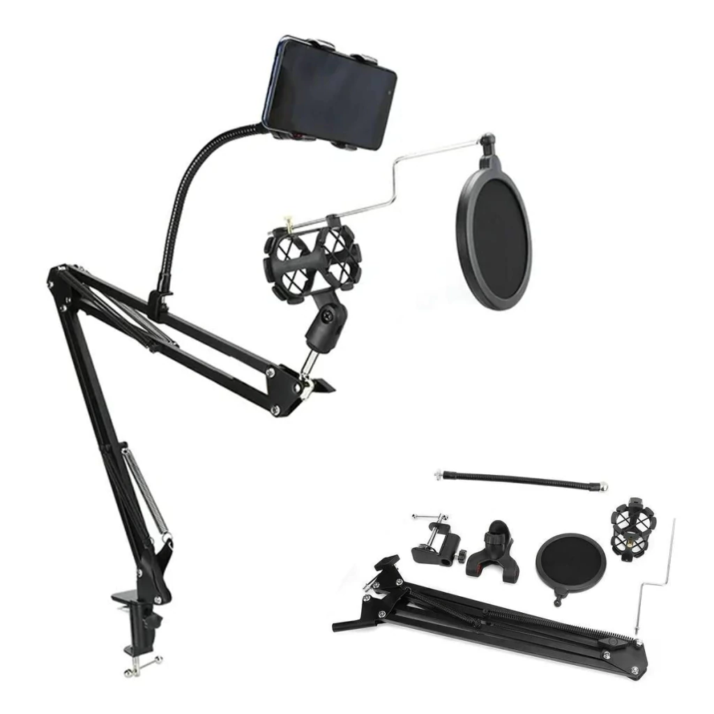 Além disso, o suporte vem com um adaptador universal para celular, possibilitando a gravação simultânea de áudio e vídeo. Ideal para podcasters, streamers, criadores de conteúdo e músicos, o suporte facilita a captura de som e imagens de maneira profissional, com praticidade e conforto, mantendo o ambiente de trabalho organizado.