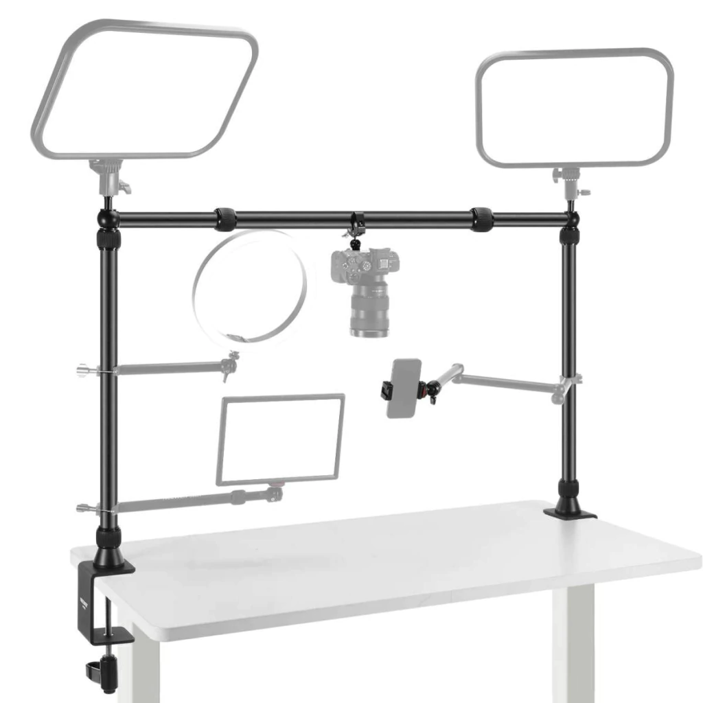acessórios, como suporte para telefone (incluído), monitor, microfone, luzes