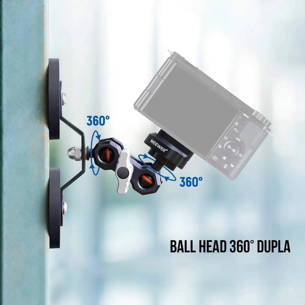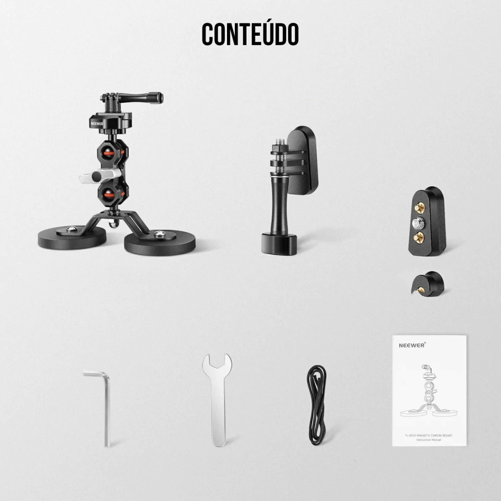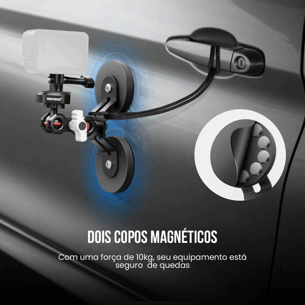 Mais forte do que um único ímã, o suporte para câmera de ação magnética FL-GP15 da NEEWER com ventosas magnéticas duplas tem uma carga útil máxima de 2 kg e pode ser firmemente aderido ao capô, teto e porta de um carro ou qualquer outra superfície metálica.