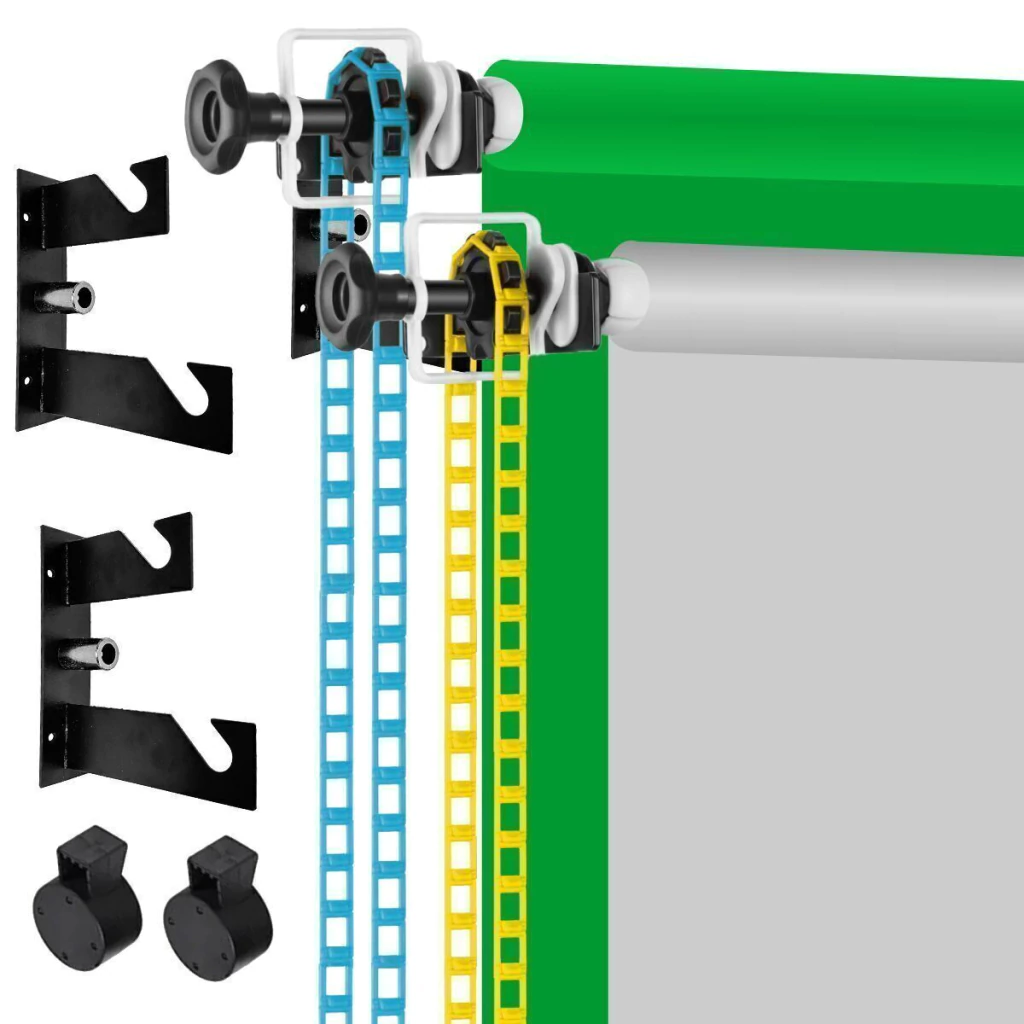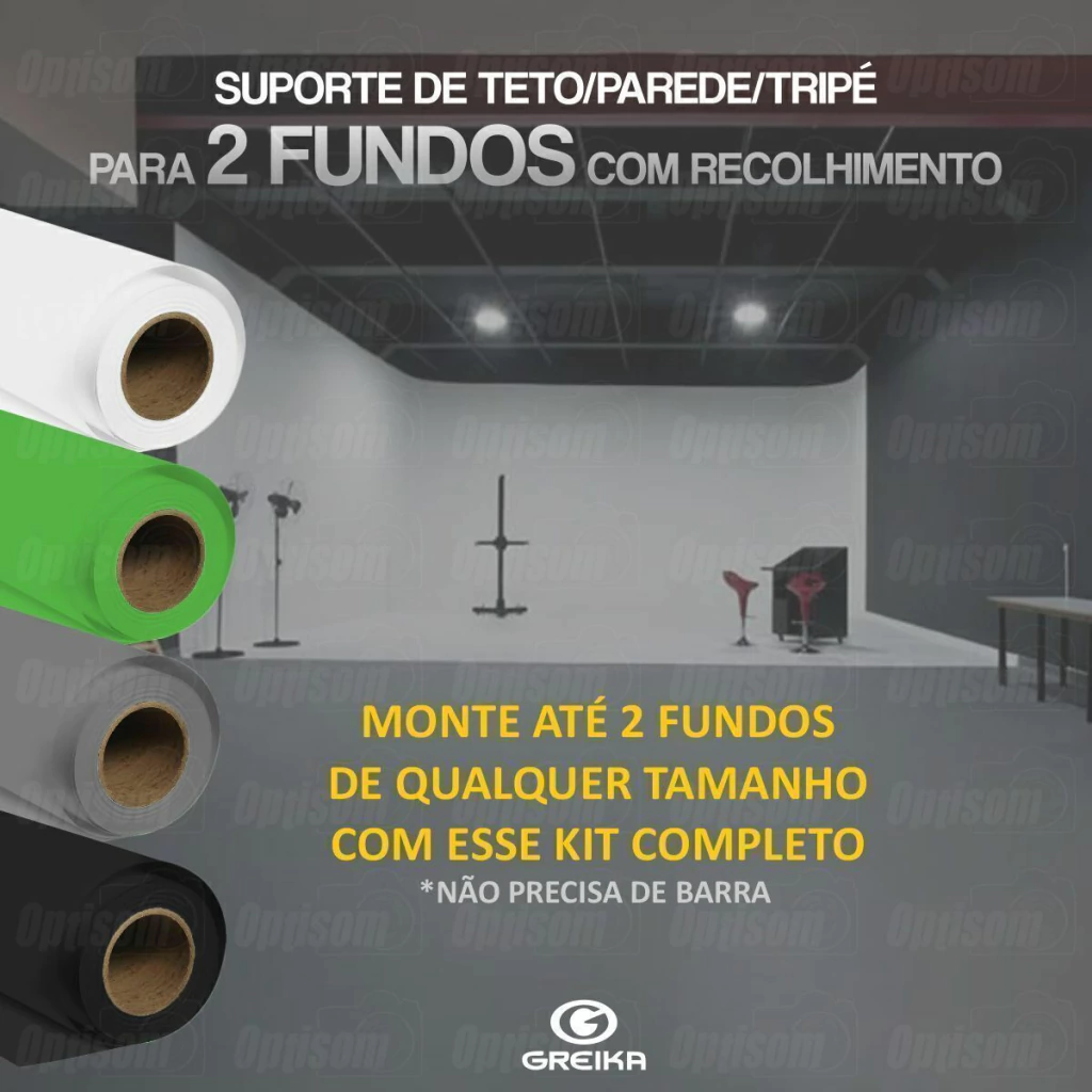 Kit Suporte ROBUSTO e firme Greika PK-2R que fixa 2 fundos fotográficos em parede, teto ou tripés de iluminação, dando mais praticidade e espaço em seu estúdio.
