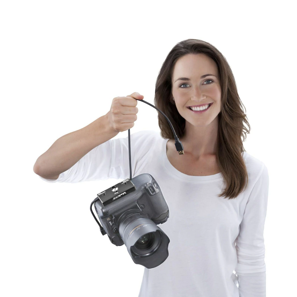 Ao passar um cabo USB ou FireWire ou HDMI pelo canal S do TetherBLOCK e prender o TetherBLOCK ao suporte de tripé da sua câmera, você poderá fotografar conectado a um computador sem medo de que tropeçar no cabo danifique as portas de dados sensíveis da câmera.