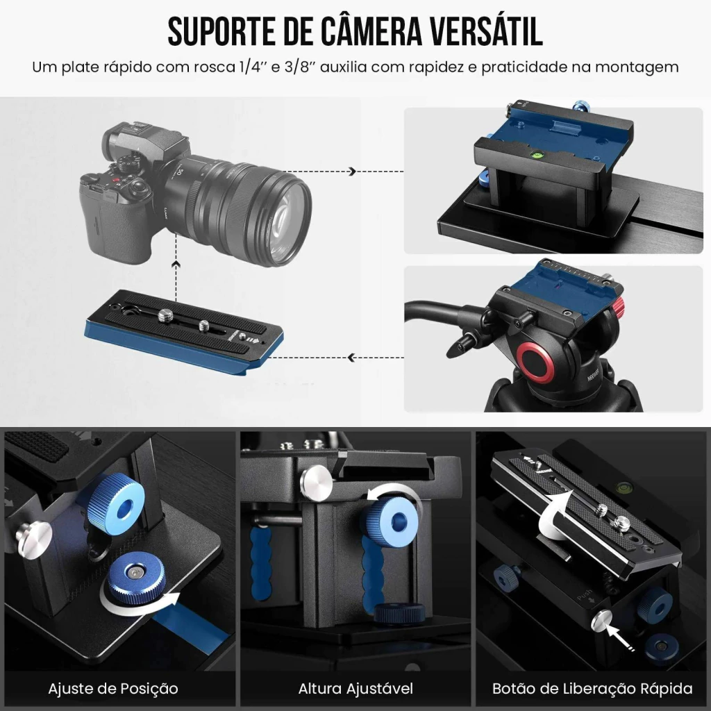 A placa de liberação rápida atualizada incluída agora é compatível com 501PL. Comparada às placas deslizantes tradicionais, a nova placa QR pode ser pressionada diretamente da parte superior e travada em 1s sem alinhamento. Use o botão de liberação para remover a placa e alternar rapidamente a câmera no teleprompter e uma cabeça de tripé. Os parafusos de 1/4" e 3/8" conectam câmeras DSLR e filmadoras de até 20kg.