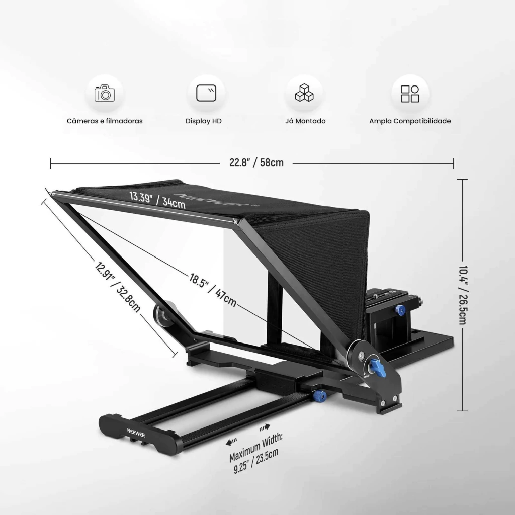 A estrutura pode inclinar a 45° para posições de visualização ideais. Para centralizar a câmera, a plataforma de montagem se move 56-89 mm para cima e para baixo e desliza no trilho de 248 mm para melhores posições de câmera. O para-sol com zíper e o para-sol com cordão evitam vazamento de luz