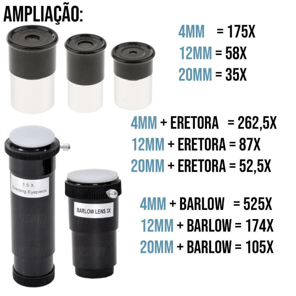 4MM= 175X (+ ERETORA = 262,5X) (+BARLOW=525X)
