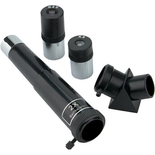 Uma lente Barlow 2x dobra efetivamente a ampliação de cada ocular para uma faixa de ampliação total entre 18x e 80x.