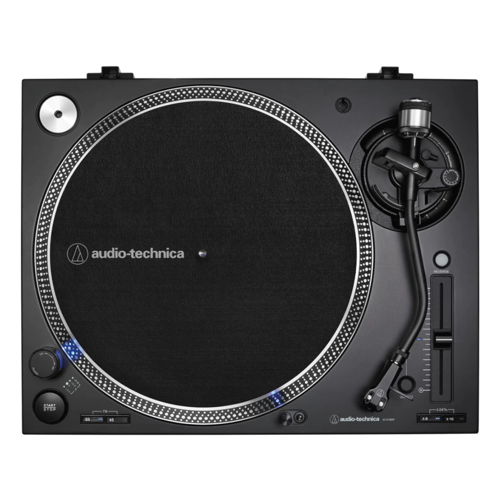 O toca-discos profissional para DJs totalmente manual AT-LP140XP possui um motor de acionamento direto de alto torque e prato de alumínio fundido, anti-ressonante.