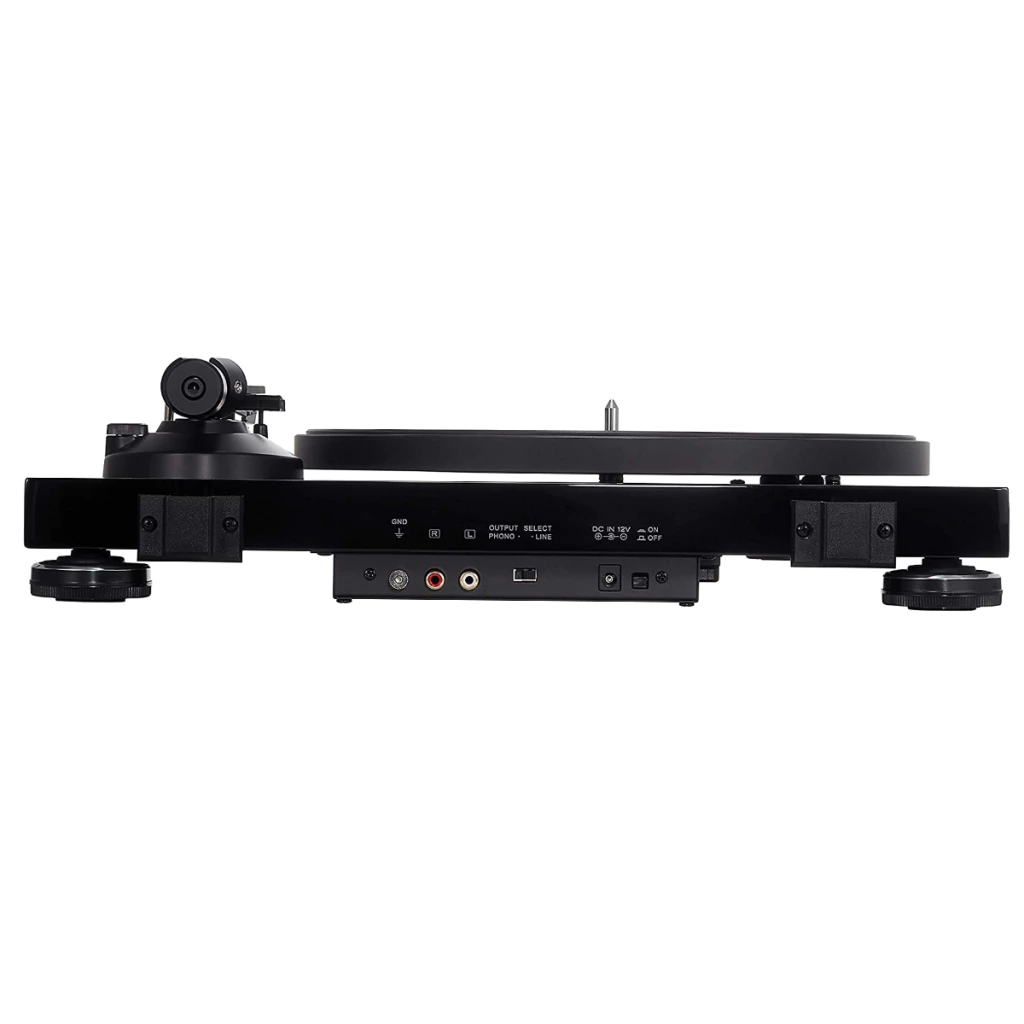 Ele inclui uma base MDF (placa de fibra de média densidade) antirressonância revestida com 30 mm de espessura, com um acabamento em preto brilhante de alto brilho, para limitar o retorno acústico de baixa frequência e um motor monitorado por sensor para garantir uma rotação precisa do prato de 33-1/3 e 45 RPM.