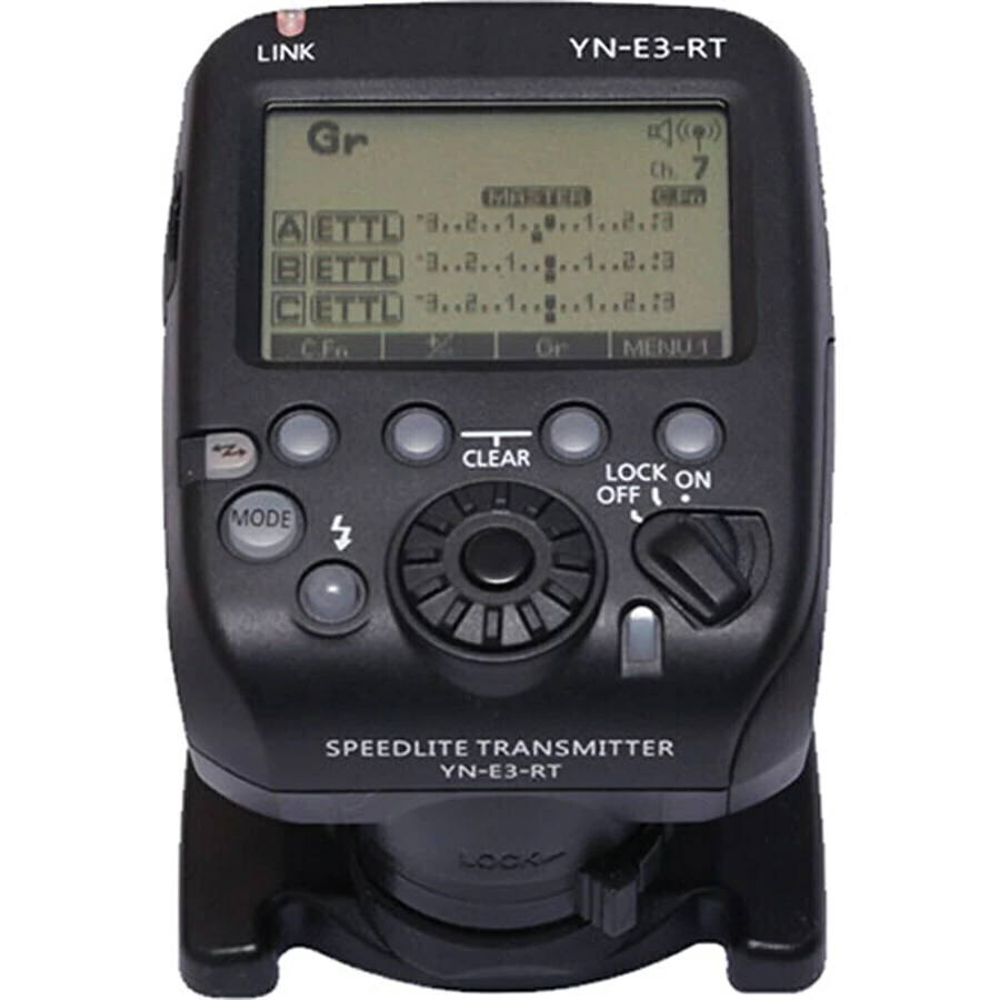 O Transmissor Speedlite YN-E3-RT para Canon Wireless da YONGNUO é um dispositivo de disparo sem fio 16 canais, 5 grupos wirelles com um alcance de 8 metros.