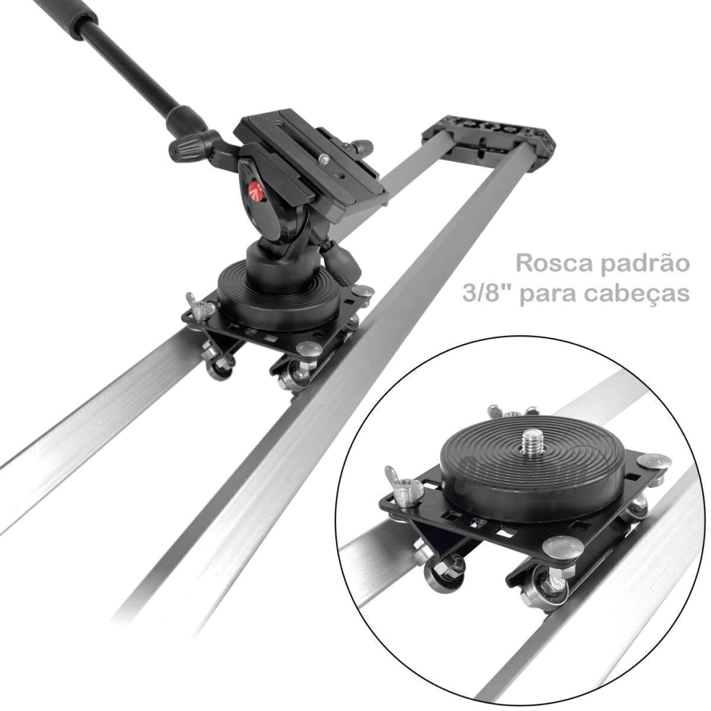 Rosca 3/8" no carrinho permite o uso com QUALQUER CABEÇA de tripé e monopé, desde que tenha essa espessura padrão.