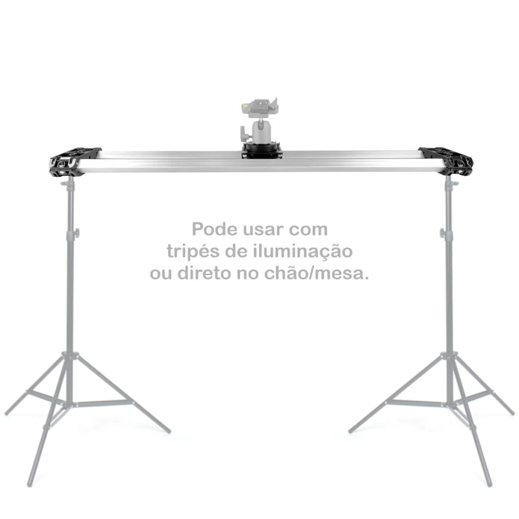 Com carrinho preso e seguro super deslizante, pode ser usado diretamente no chão, em cima de mesas e até mesmo com tripés de iluminação com rosca 1/4".