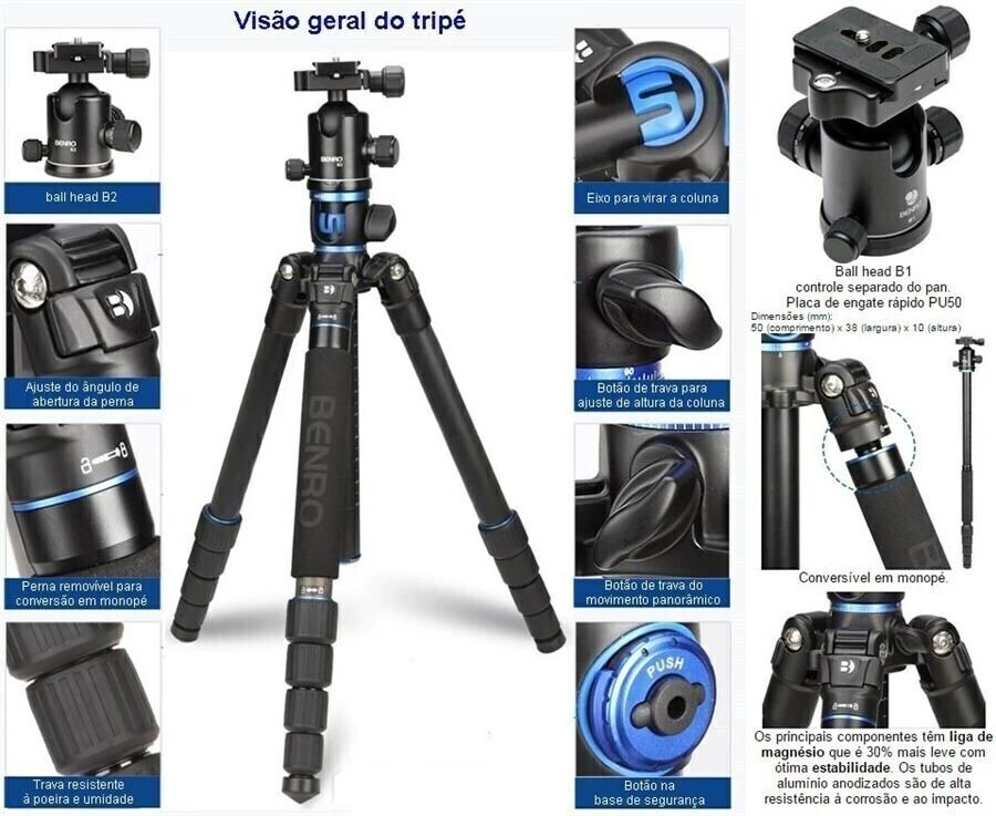Tripé Profissional Benro GA169TB1 feito em liga de magnésio garantindo leveza e estabilidade a seu equipamento, tubos anodizados contra corrosão e impacto.