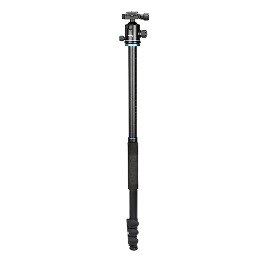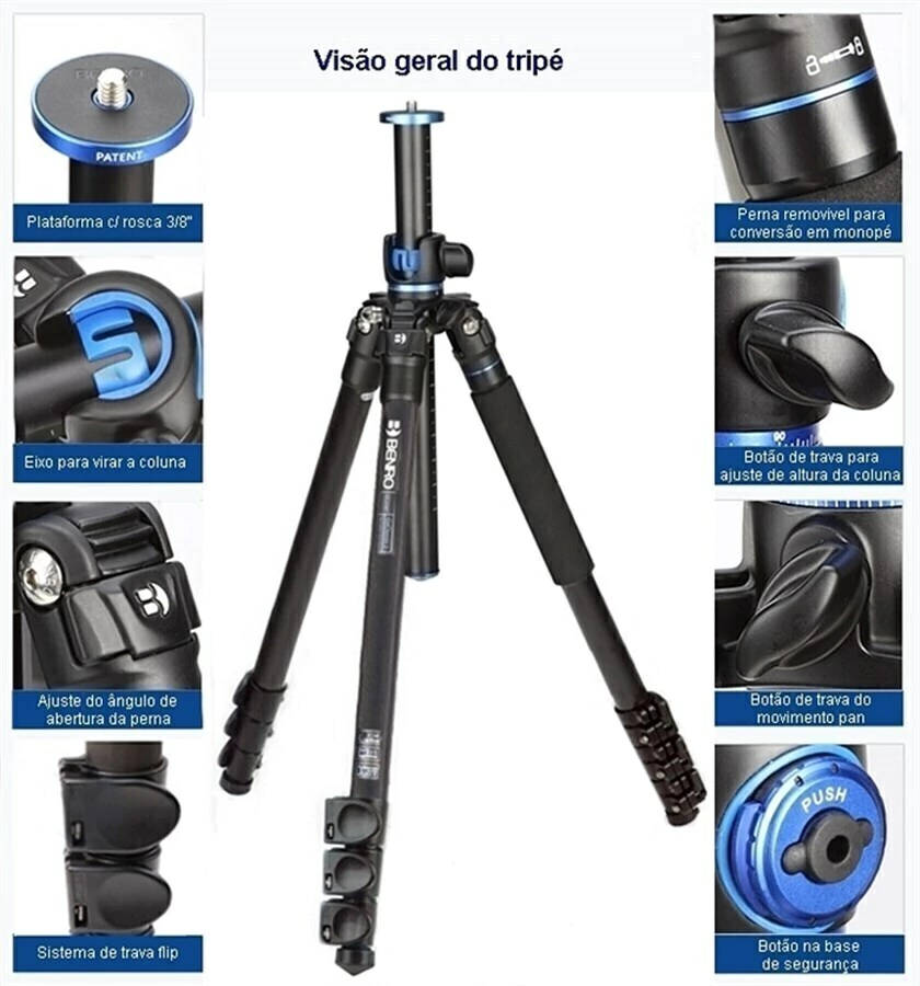 Pernas independentes com 4 seções que são travadas com modelo de trava 'flip', cabeça ballhead com capacidade de 8kg de carga.