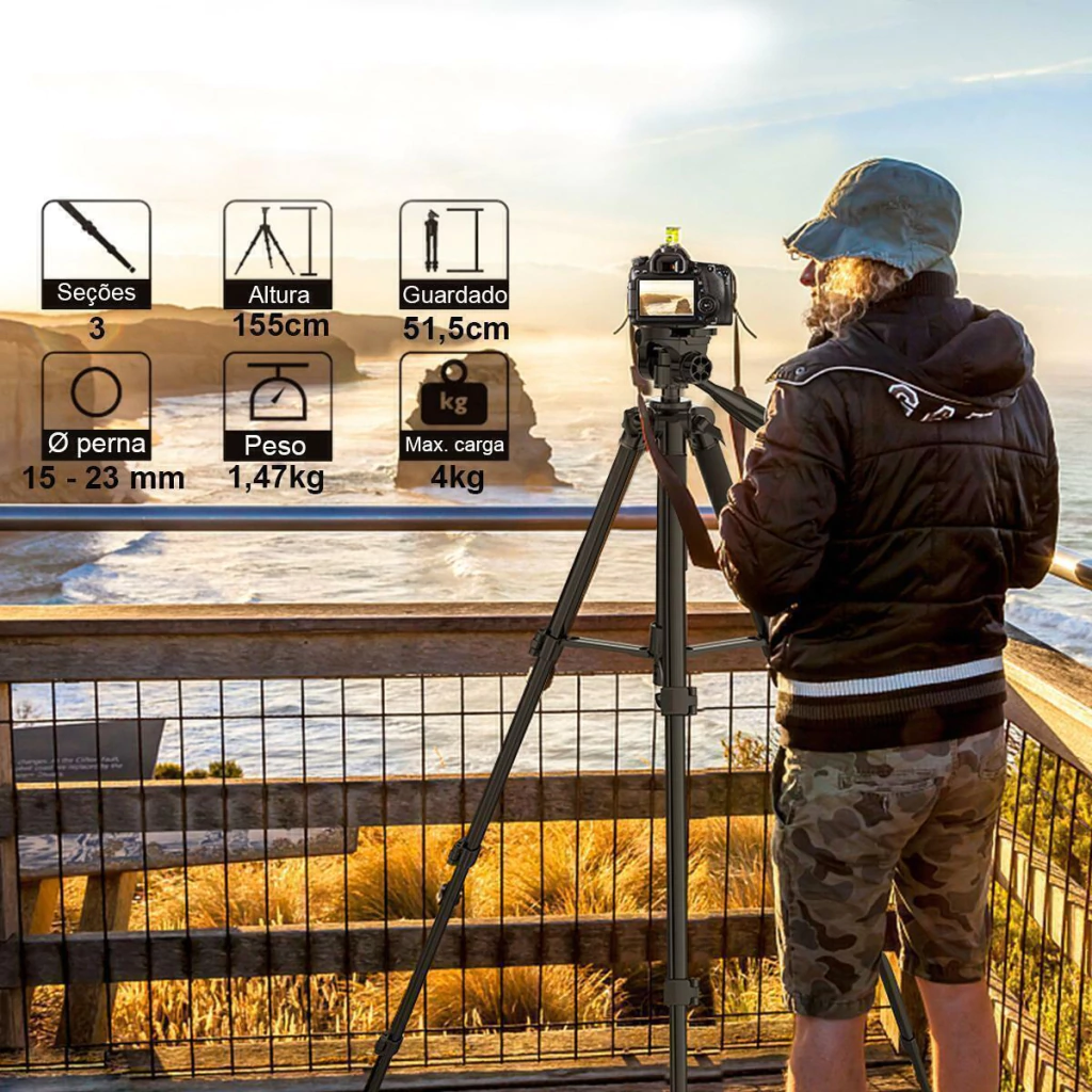 Vem com suporte para celulares de 4,8 a 10,0 cm de largura. A coluna central tem sistema de cremalheira e estrela intermediária com trava de rosca para maior estabilidade.