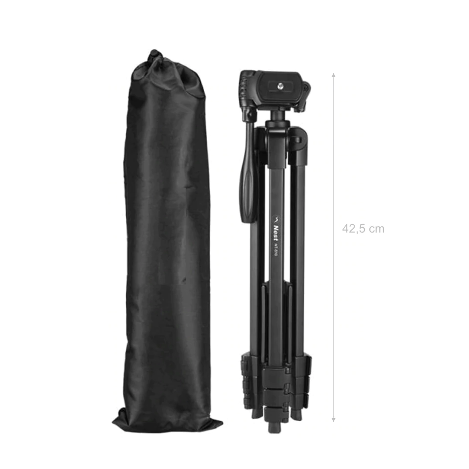 Tripé Nest NT-510 possui pernas de alumínio de quatro seções com travas 'flip' de plástico proporcionando estabilidade para montar o equipamento.