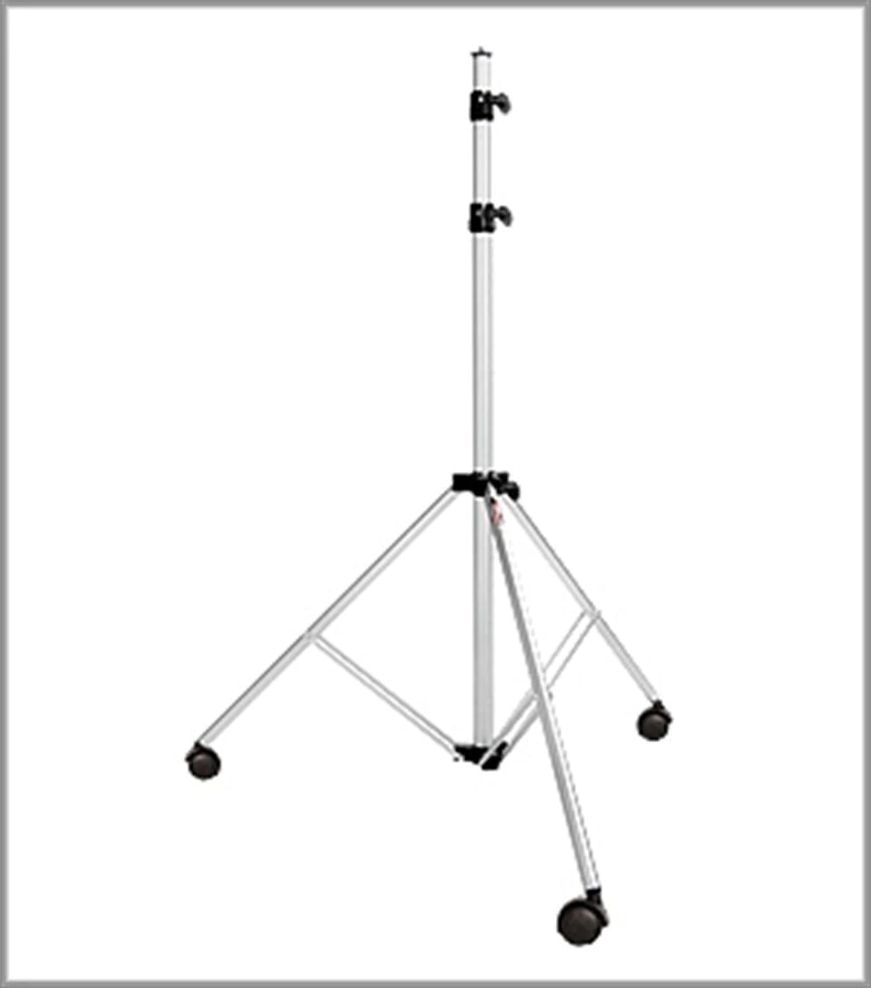 Altura mínima de 102 cm e máxima de 2,76 m. Com rodas em suas três pernas.
