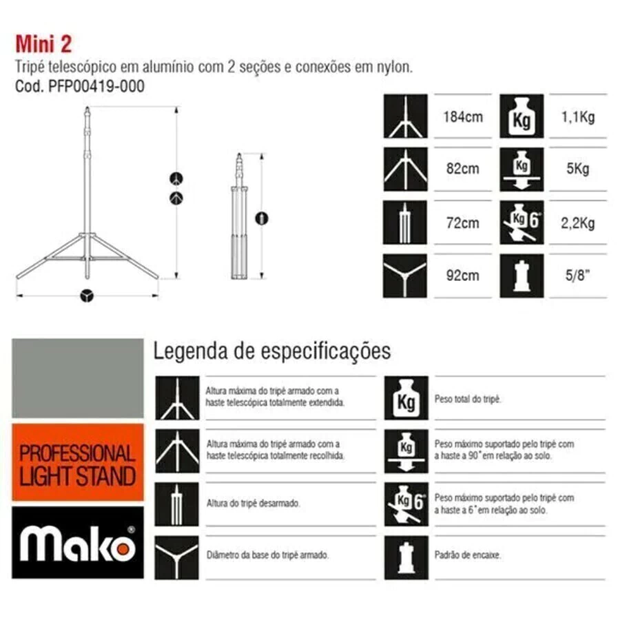 Tripé mako para iluminação com altura máxima de 1,84 m de 2 seções.