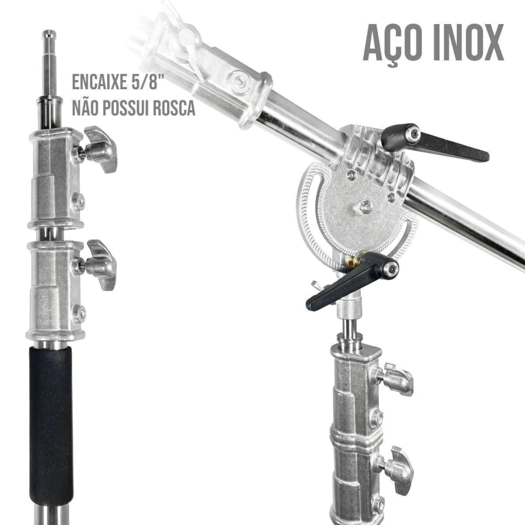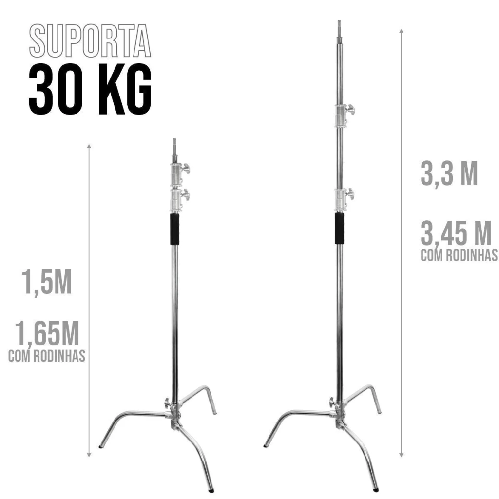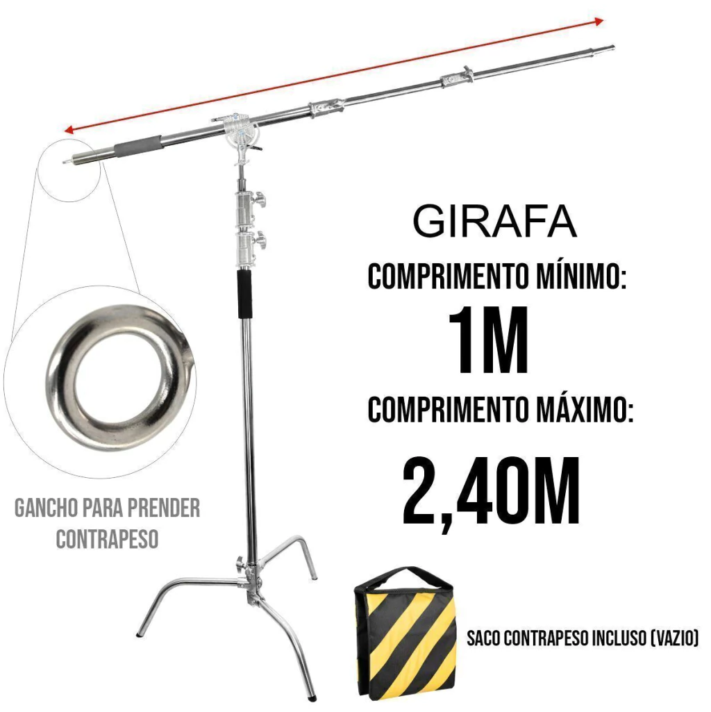 Tripé 2 em 1 Girafa SUPER ROBUSTO C-STAND Century Cromado Aço Inox com rodinhas da Greika suporta até 30kg e chega a 3,30m de altura.