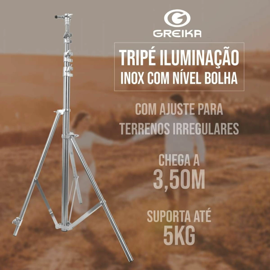 Tripé INOX ROBUSTO Greika FC-360DB suporta até 5kg e chega a 3,5m de altura e possui ajuste de ângulo para terrenos irregulares.