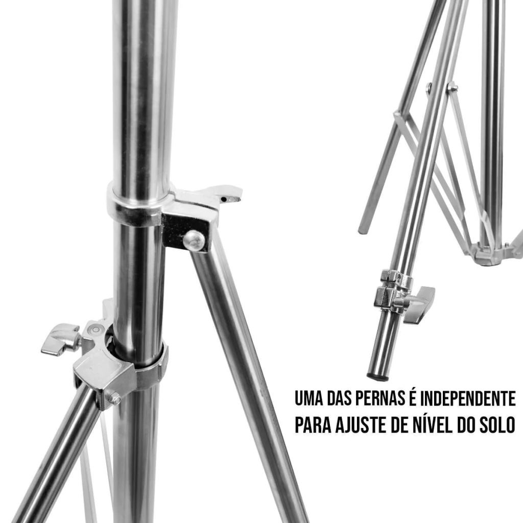 Tripé todo de metal, inclusive suas travas, garantem firmeza e robustez.