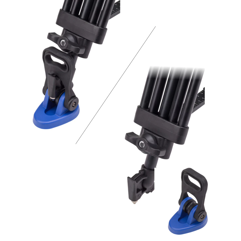 >> Além do tamanho, o KH-26NL conta com um sistema de pés de borracha/ponteiras de aço diferenciado. Para deixar o tripé com ponteira de aço, basta puxar a borracha preta com azul.