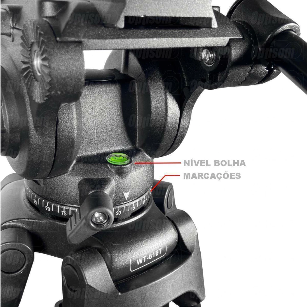Tripé Profissional Hidráulico Weifeng Greika WF -616 conta com uma cabeça removível amortecida hidraulicamente e capacidade para até 8 kg de equipamentos.