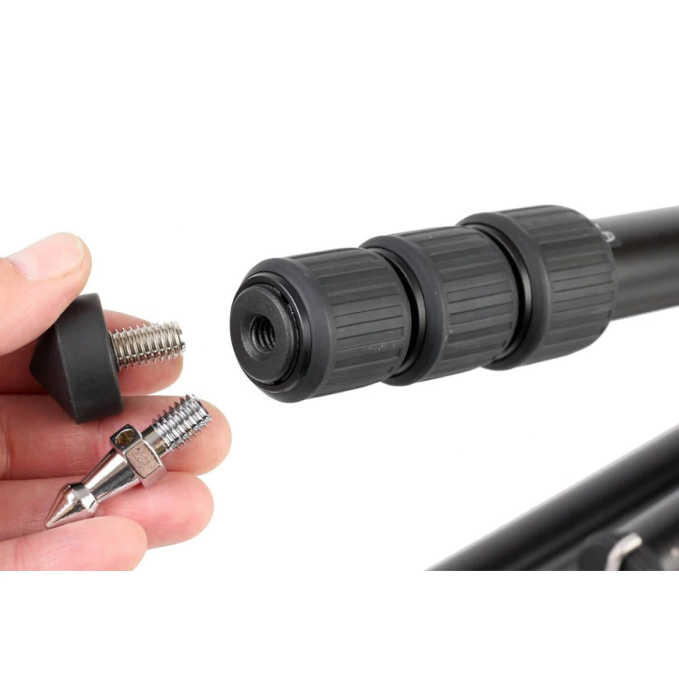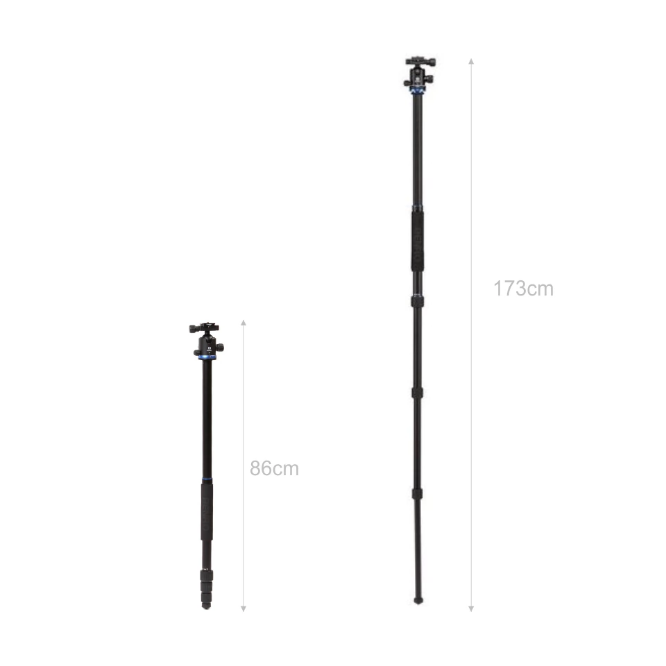 Apresenta uma perna destacável, que combinada com a coluna central cria um monopé, tornando uma combinação perfeita em uma única viagem.