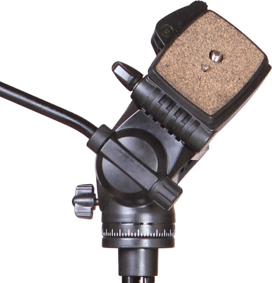 Pedestal tem gancho para contrapeso, suas pernas tem 3 seções com trava tipo 'Flip' feitas de plástico rígido, e apresenta pés de borracha.