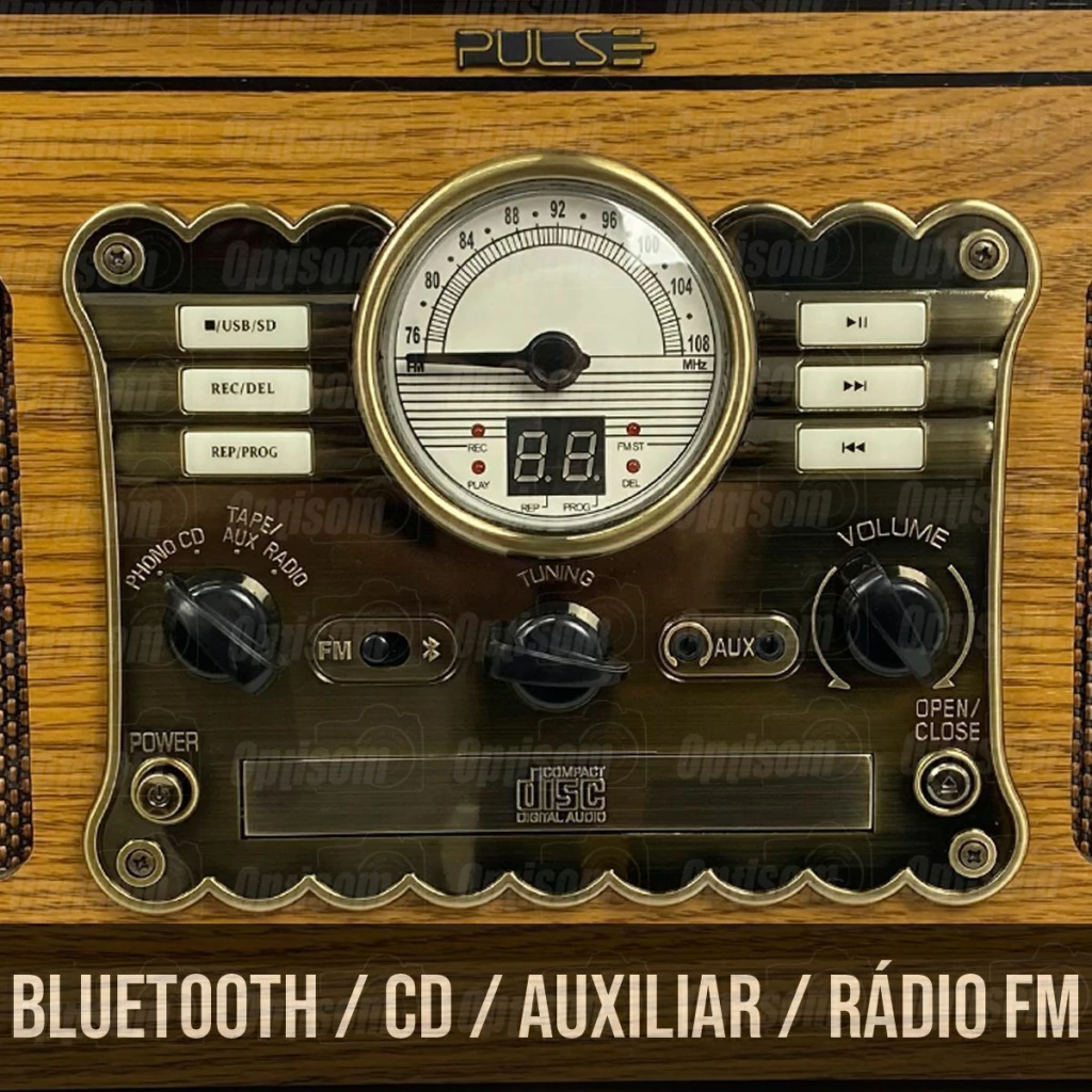 COM SOM EMBUTIDO! Essa vitrola é tudo em 1, pois conta com sistema de RÁDIO FM, BLUETOOTH, LEITOR DE CD, FITA CASSETE E PENDRIVE.