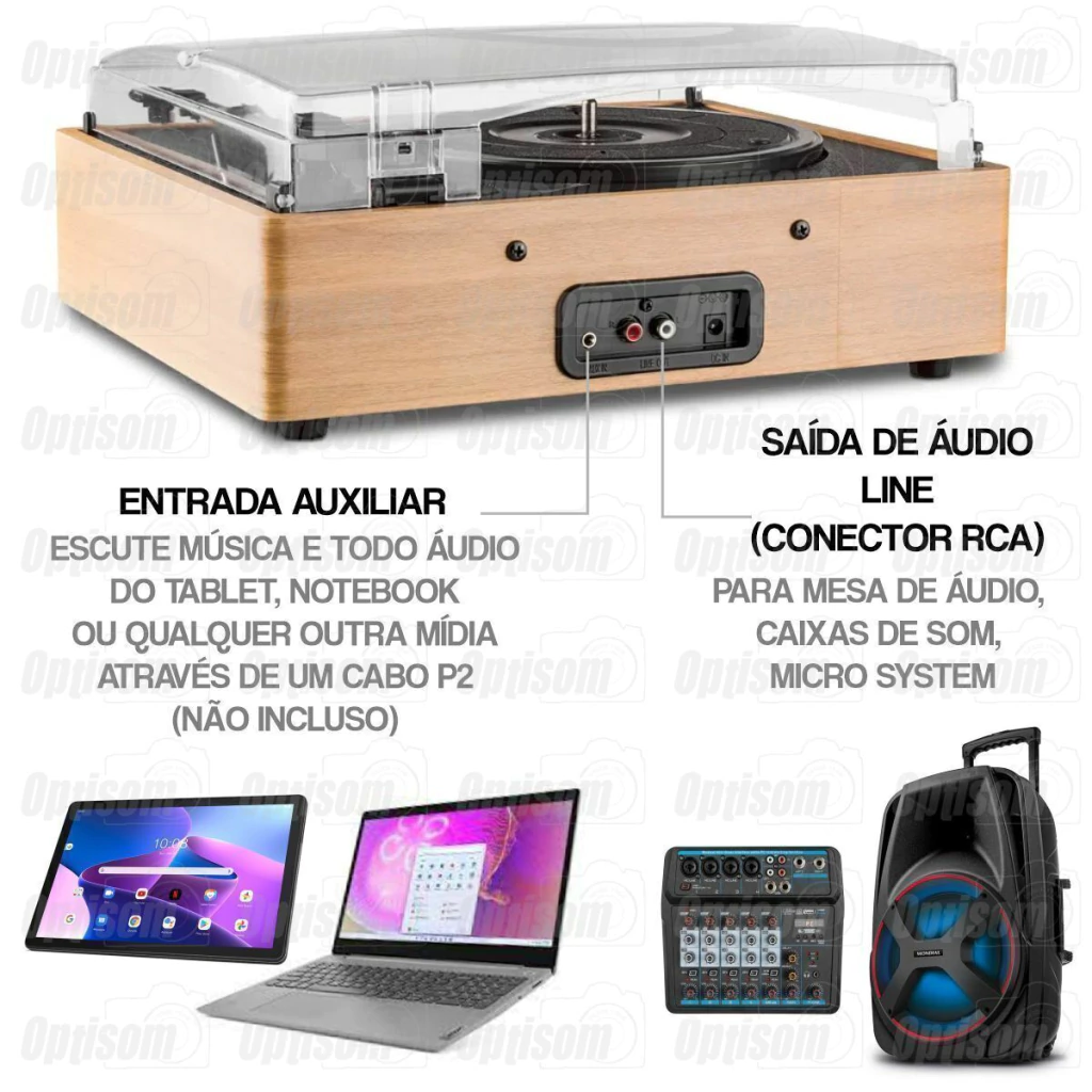 Reproduzir sons através da entrada auxiliar P2 (som sai nas caixas embutida da vitrola).